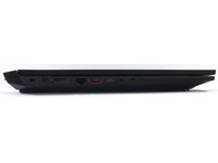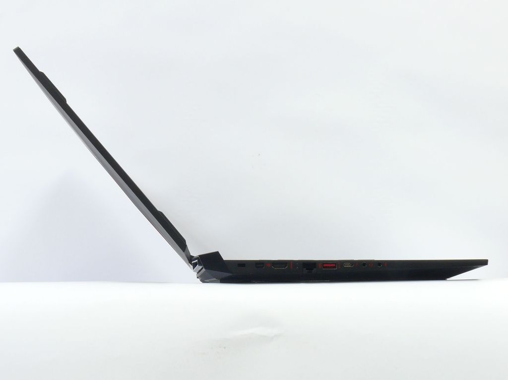 Veškerá rozhraní jsou rozložena na boky notebooku. Vlevo odzadu je to KensingtonLock, Mini DisplayPort, HDMI 2.0, LAN, USB 3.1 A, USB-C / Thunderbolt 3, audio výstup a vstup. Vpravo je nejdále vzadu konektor napájení, 2x USB 3.1 A a blíže k čelu notebooku pak čtečka SD karet. Zkosené čelo je bez jakýchkoliv prvků. Zadní straně notebooku vévodí, v rozích umístěné, opravdové výdechy chlazení.