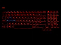 Na první pohled herní geny notebooku, jsou poznat i při pohledu na klávesnici. Hlavním poznávacím prvkem jsou barevně odlišené klávesy WASD, jsou jasně červené s bílými popiskami. Všechny ostatní klávesy jsou černé s červenými popiskami. Červená je sice zdravější pro oči, ale u červených popisek bývá problém, že už při menším šeru, začínají být hůře čitelné. Naštěstí je zde podsvícení, které problém čitelnosti v šeru řeší. Klávesnice je navíc česko - slovenská, takže na některých klávesách je i 5 symbolů, což situaci naopak zase malinko více komplikuje. Podsvícení má jednu optimální intenzitu, přepínat lze mezi podsvícením celé klávesnice, nebo samostatné čtveřice WASD.