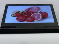Další gumové podložky jsou rozmístěny po obvodu LCD, aby zabránily dotyku obrazovky s klávesnicí (zavřený notebook). Víko lze otevřít do úhlu cca 135° a k základně je uchyceno klouby, které jsou netradičně posunuty více ke středu notebooku. Po vnějších stranách kloubů jsou robustně vyhlížející imitace nádechu chladicího vzduchu.