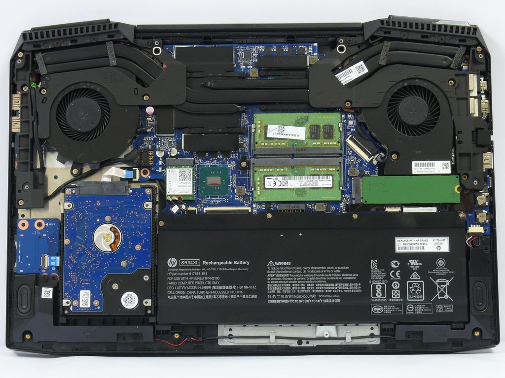 Znalý uživatel si může sám vyměnit RAM, HDD i SSD (případně i baterii a WiFi modul). Notebook lze relativně snadno rozebrat. Je znát, že u HP při návrhu těla notebooku přemýšleli o tom, jak dobře to půjde. Ze spodu jsou 2 + 8 křížové šroubky, 2 jsou do krytu aretovány i po odšroubování, ostatních 8 je do těla zašroubováno šikmo a po odšroubování je lze vyjmout. Dva aretované šroubky jsou umístěny přibližně na protilehlé úrovni kloubu a v jejich oblasti lze prsty zabrat za spodní kryt a oddělit ho od spodku těla notebooku. Je k tomu potřeba trochu zabrat, je zřetelně slyšet jak povolují plastové západky, proces se jeví nebezpečně, ale s trochou citu lze víko bezpečně odejmout. Při zavírání notebooku je, před dotažením šroubů, potřeba opatrně všechny západky zaklapnout zpět a myslet na správný úhel zašroubování osmi vyjmutelných šroubků.