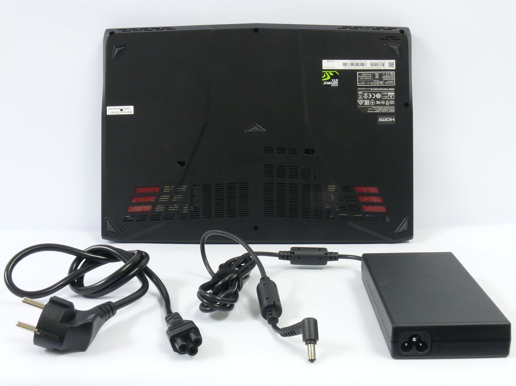 Součástí balení je notebook, 180W napájecí adaptér, třížilový přívodní kabel se zahnutou koncovkou a základní tištěná dokumentace.