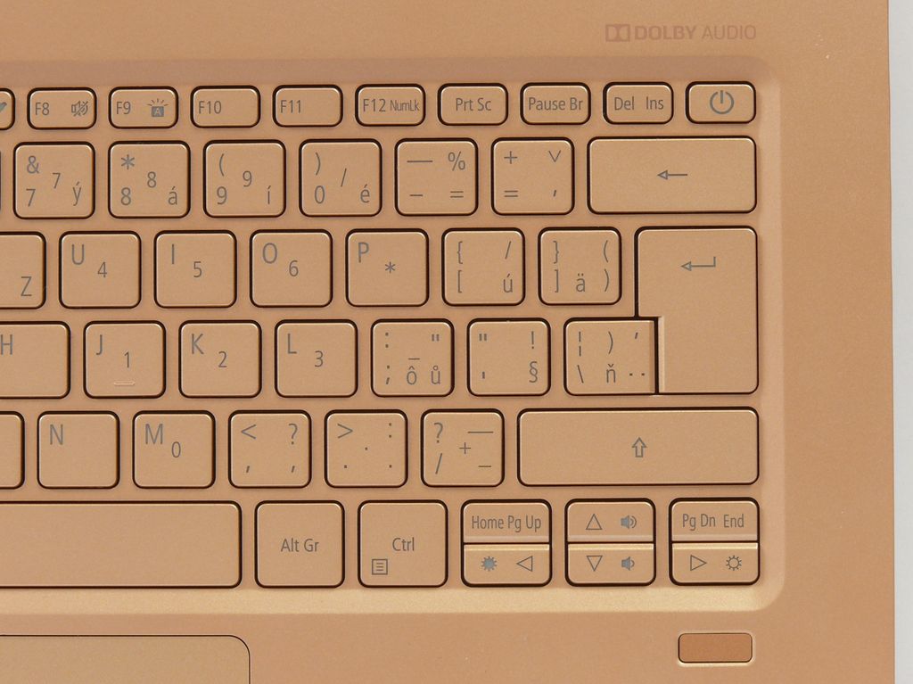Kurzorové šipky mají poloviční výšku kláves. Nad šipkami do stran se o jednu stejně nízkou klávesu dělí Home s PgUp a PgDn s End, druhou funkci je třeba vyvolat současným stiskem klávesy Fn. Raději mám řešení, kdy jsou uvedené funkce zakomponovány do kurzorových šipek + Fn. Zde je v šipkách umístěno ovládání hlasitosti a jasu podsvícení, u Acer notebooků to bývá standardem.