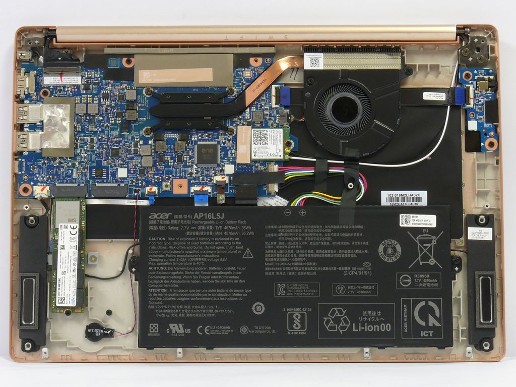 Notebook lze poměrně snadno rozebrat, potřebujete k tomu trochu zručnosti a trpělivosti. Jedinou drobnou komplikací je potřeba malého hvězdicového šroubováku. Uživatelsky lze vyměnit Wi-Fi modul, SSD modul a baterii. Nejpříjemnější vlastností tohoto notebooku je výše zmíněná přítomnost druhého volného M.2 slotu pro budoucí rozšíření o další SSD modul.