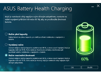 Asus k notebooku dodává nainstalovaný program pro nastavení šetření životnosti baterie. Program se jmenuje Battery Health Charging, udělal jsem PrintScreen jeho nabídky. Na ověření reálného účinku by bylo potřeba více času a 2 stejné notebooky.