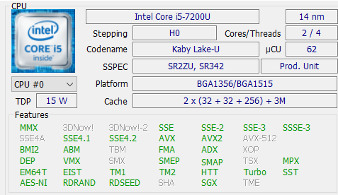 Mobilní procesor Intel Core i5-7200U pochází z předposlední sedmé generace. Má dvě fyzická jádra, celkem 4 výpočetní vlákna. Základní takt procesoru je 2.5 GHz, ale Intel umožňuje výrobcům dle potřeby základní takt fixně nastavit na nižších 800 MHz nebo i vyšších 2.7 GHz. Asus zvolil vyšší možnost. TurboBoost dokáže procesor přetaktovat až na 3.1 GHz.
