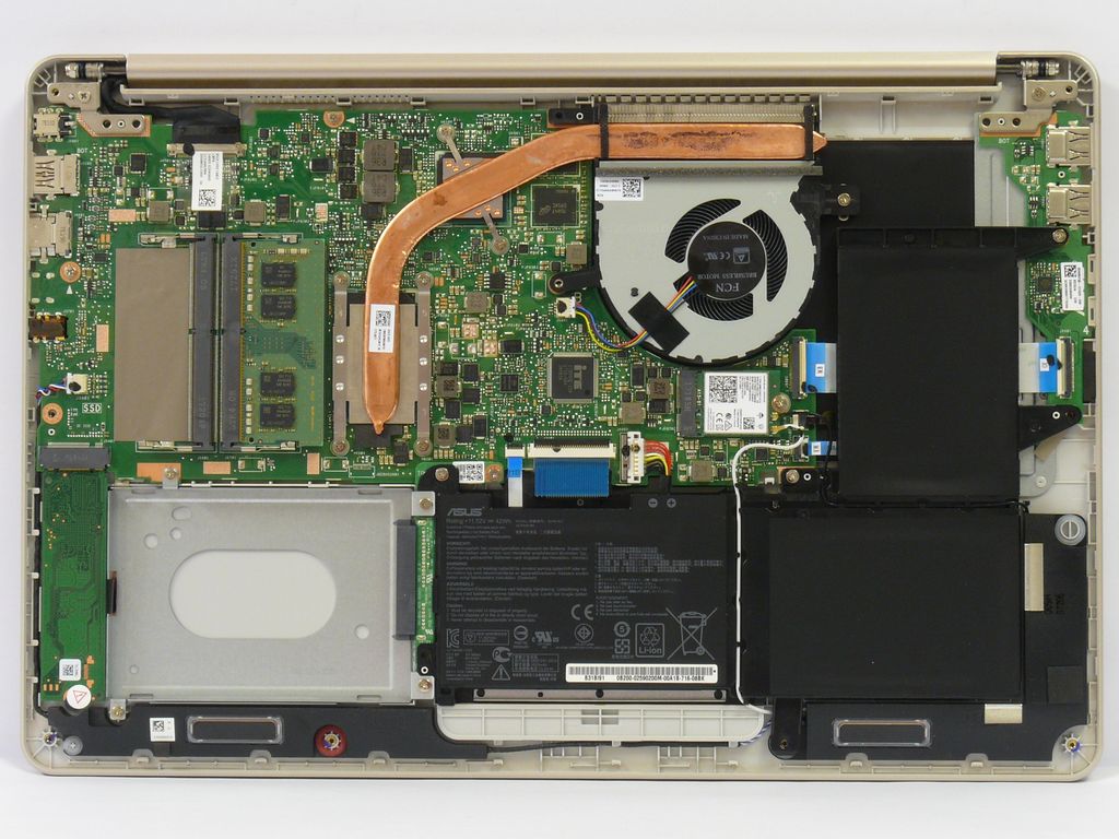Rozebrat notebook je malinko složitější, než by se mohlo na první pohled zdát. Povolit standardní křížové šrouby je snadné, dva jsou ale ukryté pod zadními gumovými nohami. Šrouby také mají různou délku, takže je potřeba vědět, který kam patří. Po uvolnění šroubů je třeba najít správná místa na uvolnění plastových západek, nejlépe je začít odzadu mezi klouby a postupovat do stran. Je potřeba postupovat opatrně aby vše proběhlo bez poškození. Složit notebook zpět je snazší, stačí jen po obvodu vše zaklapnout, zašroubovat zpět správné šrouby na správná místa a přilepit zpět gumové nohy.
