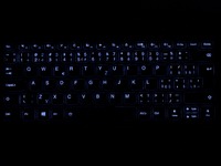 Barva klávesnice ladí se zbytkem notebooku (jen lehce světlejší odstín). Barva všech popisek, včetně speciálních, je bílá. Popisky jsou dobře čitelné i při mírném šeru. Za tmy lze použít 2 stupně podsvícení klávesnice. První stupeň podsvícení díky PWM regulaci bliká na frekvenci 150 Hz. Podsvícení funguje i v BIOSu (u některých notebooků jen s ovladači v OS). Rozložení kláves je v zásadě klasické, podobné už několik posledních let. Větší výtku bych měl snad jen k absenci mezer mezi skupinami kláves F1 až F12 (bohužel již převládající standard posledních let), prioritu speciálních funkcí nebo původních lze přepínat v BIOSu. Malinko se prohýbá, kolem klávesy K. Celkově se jedná o docela příjemnou klávesnici, i pro rychlé psaní.